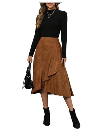 More information about SweatyRocks Women's Ruched High Waist Skirts Asymmetrical Ruffle Hem Casual Solid Zipper Midi Skirt