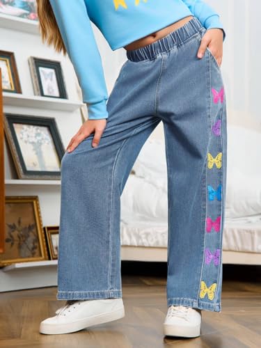 HOT ! Haloumoning Girls Butterfly Print Jeans Kids Elastic Waist Wide Leg Denim Baggy Pants with Pockets 5-14Y