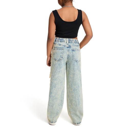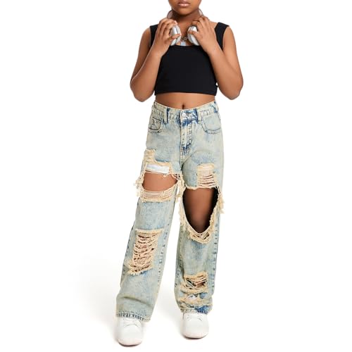 Ripped Denim Jeans for Kids Straight Wide Leg Distressed Washed Cotton Baggy Pants Casual Lightweight Trendy Streetwear 6