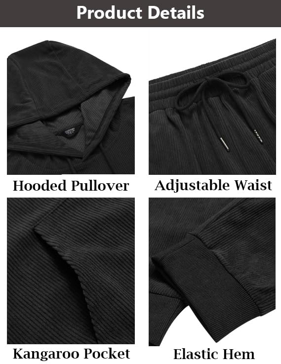 • Features: Solid color hooded pullover has elastic at the hems all around and a kangaroo pocket in front; Sweatpants come with drawstrings and a couple of pockets on each side and back for keys or wallet