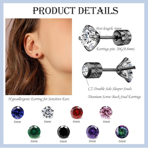 • SCREW BACK EARRINGS: Earrings pin: 20G(0.8mm), CZ size: 6mm, post length: 6mm, screw back: 4mm. Double side titanium screw back studs earrings, easy to wear and take off, would be comfortable to sleep in. The back of the hypoallergenic earrings is also inlaid with CZ, you can change the backs of the earrings that suite your tastes or the look you want