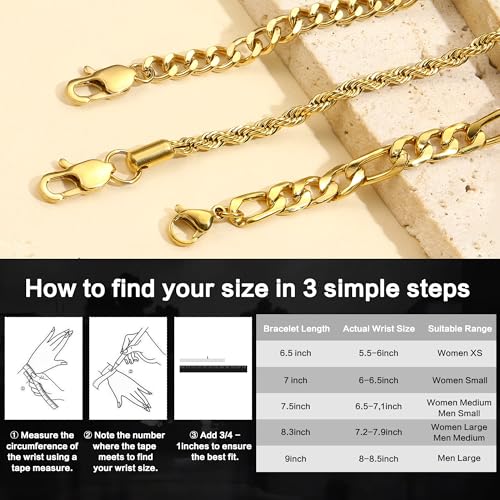 • Chain Bracelet for Men: A set of men's bracelet offers 3 styles, including a Figaro chain for men, a Rope chain for men and a Cuban link bracelet for men. Classic design mens 14k gold bracelet are stunning enough to fit all styles of clothing. Whether worn alone or stacked together, it can provide diverse styles and exquisite charm