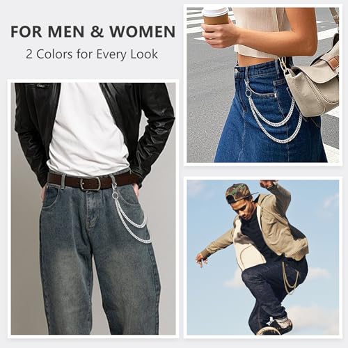 2 Pcs Pants Wallet Chains for Men Women Heavy Duty Jean Belt Pocket Chains with Lobster Clasp Hip Hop Goth Biker Style Metal Silver and Gold 1