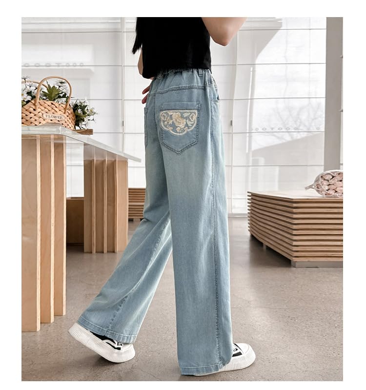 Girls Wide Leg Jeans Kids Baggy Elastic Waist Casual Ice Cool Denim Pants with Pockets 7
