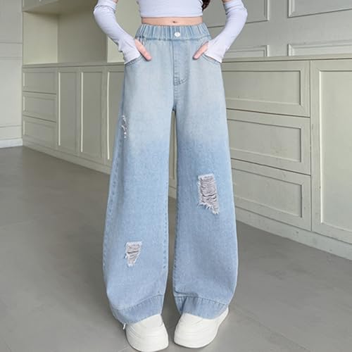 HOT ! Viatabuna Baggy Ripped Jeans for Girls High Elastic Waist Wide Leg Distressed Denim Pants Kids Cute Pull On Jeans 5-14 Years
