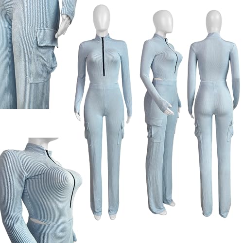 • FEATURE: Ribbed body suits for women, half zip ribbed long sleeve tops for women, stand collar, high waist pants with elastic waistband, wide leg cargo pants with pockets, solid color, slim fit, solid color, high elasticity.
