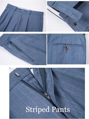 • CLASSIC DESIGN——Men's strioped suits blazer jacket featuring peak lapel, single-breasted one button closure, flap pockets at sides, comfy padded shoulders, a left chest pocket and an inner pocket for storing sunglasses, change. Single breasted 4 button vest and flat front straight leg pants.Gift a metal brooch