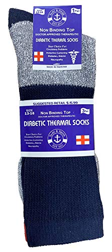• 12 PAIRS OF MENS KING SIZE THERMAL DIABETIC SOCKS: Specially designed crew socks for those with diabetes, edema, neuropathy and other ailments. Designed for those with extra large feet Big & Tall Mens diabetic socks. Loose fitting top of socks allow for better circulation than regular socks. Sock size 13-16 fits mens shoe size 12-15