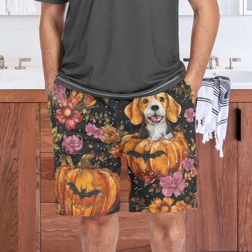 HOT ! Beagle Pumpkin Bat Flowers Pajama Bottom Shorts for Men Soft Casual Sleep Lounge Shorts with Pockets S-XXL