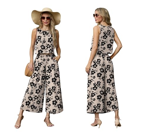 Lepunuo Womens Summer 2 Piece Outfits Sleeveless Crop Top Flowy Wide Leg Pants Matching Sets Vacation Beach Travel Outfits 2