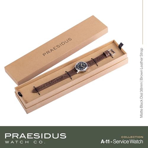 • 𝗔-𝟭𝟭 𝗪𝗔𝗧𝗖𝗛𝗘𝗦 𝗙𝗢𝗥 𝗠𝗘𝗡 : The Praesidus Service Watch is an ode to the iconic A-11 spec. With a rich connection to World War II (WW2 Watch), this men's wrist watches (Black Dial 38mm & Brown Leather Strap) is a perfect collector's item for military enthusiasts. Its classic military-inspired design is a tribute to the simple yet efficient timekeeping workhorse of US soldiers, blending history and modernity in a unique timepiece.