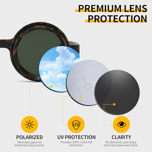• 2.Ultra-Light Polarized PC Frame:Crafted for all-day wear, our featherlight polycarbonate frame offers military-grade durability without the weight. Polarized lenses eliminate blinding glare while blocking 100% UVA/B/C rays.