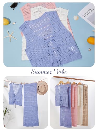 Fisoew Womens Summer Crochet Swim Cover Up 2 Piece Sleeveless Front Tie Crop Tops Beach Maxi Skirt Boho Coverup Set 3