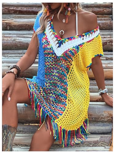 More information about SHENHE Women's Fringe Hem Color Block Knitted Crochet Swim Coverup Sheer Beach Dress