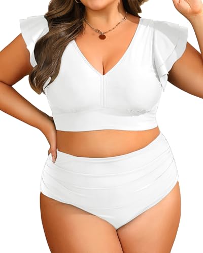 • Plus Size Ruffle Sleeve Bikini Set: Experience a blend of vintage style and modern comfort with our bikini top, featuring retro double ruffled sleeves. This piece is designed with a removable padded bra for optimal comfort and support. Its long lining design offers additional coverage, making it ideal for larger busts. The V-neck cut tastefully highlights your cleavage, ensuring a balance of allure and modesty.