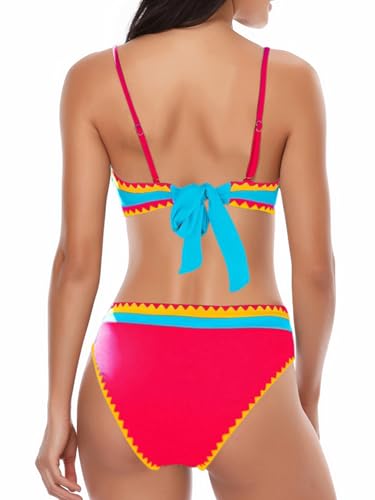 • Vibrant Neon Color Block Design: This eye-catching two-piece swimsuit features a solid bold neon rose red and blue contrast color trim pattern with patchwork details, making it a standout choice for summer beach days, pool parties, or tropical vacations