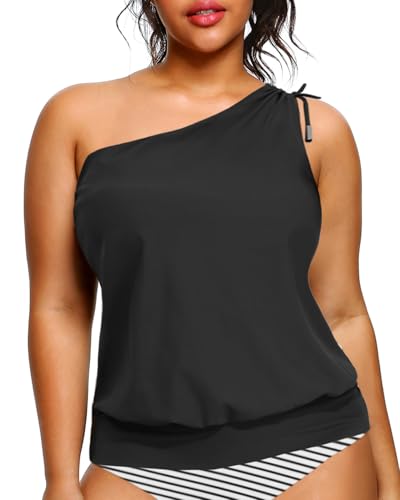 • Plus Size Tankini Tops for Women: The black one-shoulder tankini top with removable pads provides good support and comfort. The wide strap with a drawstring offers custom coverage and stays in place with ease.