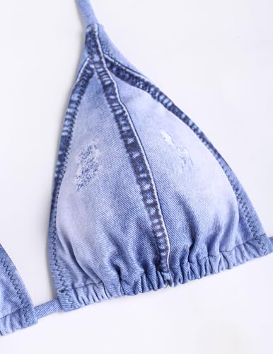 More information about ZAFUL Bikini Sets for Women Denim Print Halter Neck Two Piece Swimsuits Sexy Open Back Triangle High Cut Thong Bathing Suit