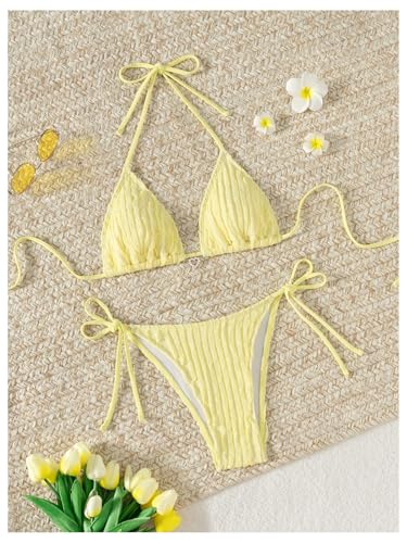 • Features: Two piece swimsuit for women, textured, halter neck, triangle cup, tie side