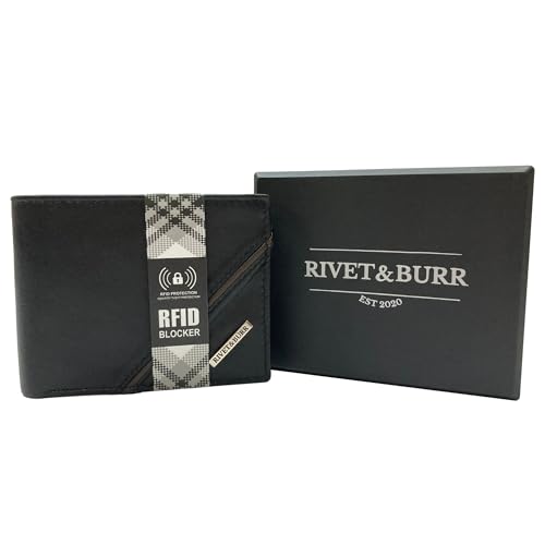HOT ! RIVET & BURR Genuine Leather Bifold Wallet for Men – RFID-Blocking Slim Wallet - Gift Box, Vanity Tray & Keychain with Textured Stripe Design & Metal Logo Badge (Black)