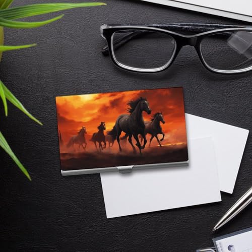 HOT ! Slim Metal Business Card Holder - Horses Red Glowing Clouds Aluminum Alloy Card Case with Buckle Closure, Holds 20 Cards & Cash, Professional Credit Card Size ID Holder for Men Women Gift