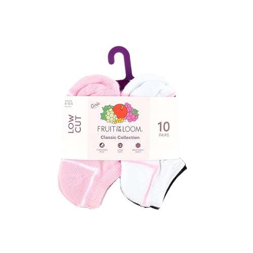 Fruit of the Loom Girls Socks - Low Cut Ankle Socks 10 Pack - Cushioned, Soft Stretch, No Show Toddler/Little Girls 6