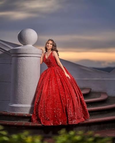 More information about Sparkly Sequin Quincenera Dresses Glitter V Neck Ball Gown Sleeveless Puffy Dress Sweet 16 Dresses for Women