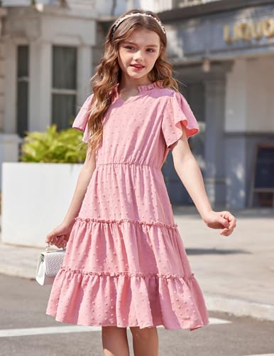Arshiner Girls Dresses Summer Ruffle Sleeve Swiss Dot V Neck Twirl Birthday Party Midi Dress with Pockets 6