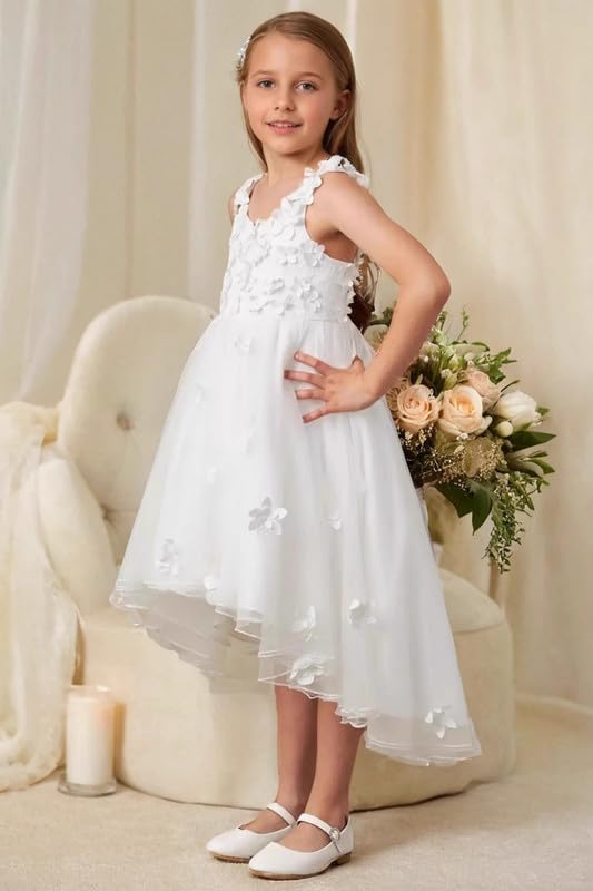 • Unique Design - First communion dress for girls boast a soft lace bodice and straps, framed by sash with bowknot. Little girl dress features with petal applique design, beads, sleeveless, v-neck, Hi-lo and hidden zipper closure on the back.
