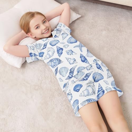 Blue White Seashells Summer Pajamas Set Silk PJS Set Satin Sleepwear Short Sleeve Button Down Nightwear 5-14Y 5