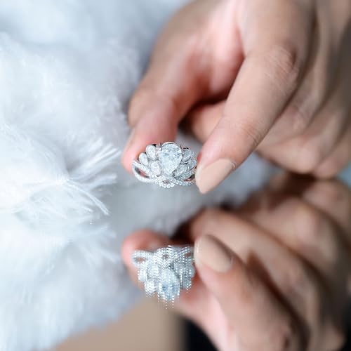 • This sparkling cocktail engagement ring features stunning crown design that is sure to turn heads while you make statements. Embellished with teardrop moissanite of 7X10mm size weighing approx 2 carats at the center, and 3X4mm stones on the sides for a prismatic effect.