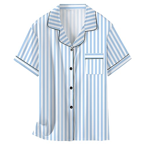 Schbbbta Girls Pajamas Set Button Down Short Sleeves Satin Shirts Sleepwear 2 Piece silky PJ Sets New Stripe Blue Years = Tag 5