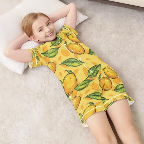 Satin Pajama Sets Short Sleeve Lemon Leaf Pattern Button Down Silky Nightwear 2 Piece PJS 5-14Y 6