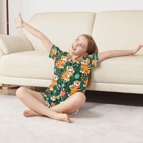 Satin Pajama Sets Short Sleeve Christmas Cute Tigers with Bells Button Down Silky Nightwear 2 Piece PJS 5-14Y 7