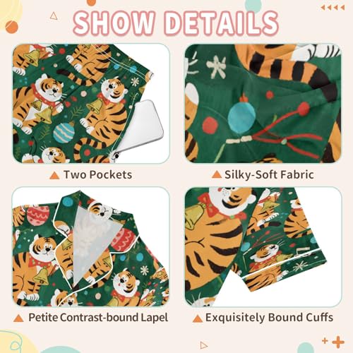 More information about Satin Pajama Sets Short Sleeve Christmas Cute Tigers with Bells Button Down Silky Nightwear 2 Piece PJS 5-14Y