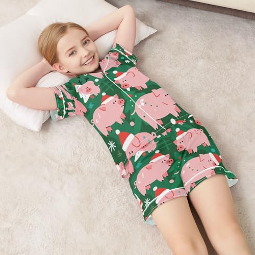 Satin Pajama Sets Short Sleeve Pig Pattern with Christmas Button Down Silky Nightwear 2 Piece PJS 5-14Y 7