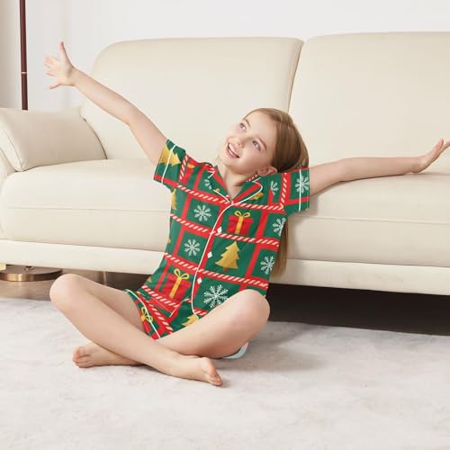 Satin Pajama Sets Short Sleeve Christmas Bells Tree Pattern Button Down Silky Nightwear 2 Piece PJS 5-14Y 7