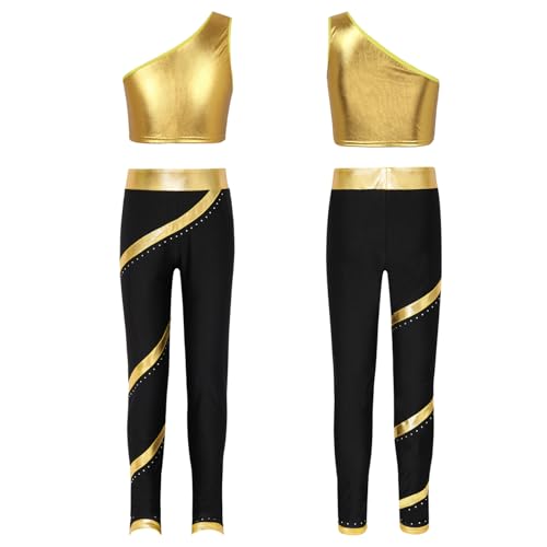HOT ! Kids Girls Shinymetallic Gymnastic Jumpsuit Set One Shoulder Crop Top With Legging Ballet Yoga Tracksuit