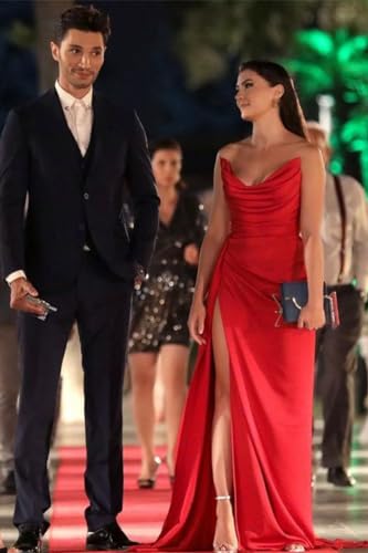 HOT ! Satin Mermaid Prom Dresses for Women Long Ruched Strapless Corset Formal Wedding Guests Dresses with Slit