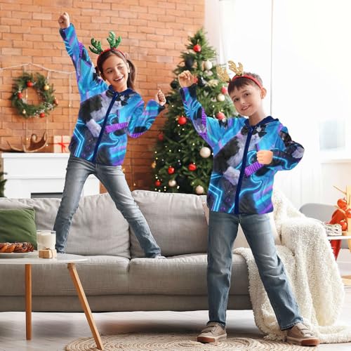 Cool Cat Plays Guitar Neon Toddler Fleece Jacket Girl Boys Hooded Fleece Jacket Coat Warm Outwear Zip-up 3-10T 3