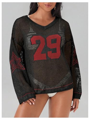 • Feature: Number Print, V Neck, Long Sleeve, Hollow Out, Crochet, Loose Fit, Cover Up Tops for Women