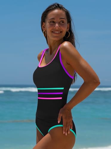 HOT ! popvil Women's One Piece Swimsuits 2025 Tummy Control Bathing Suit Beach Outfit Sexy Neon 1 Piece Sport Swim Suits,Stripe2,Large