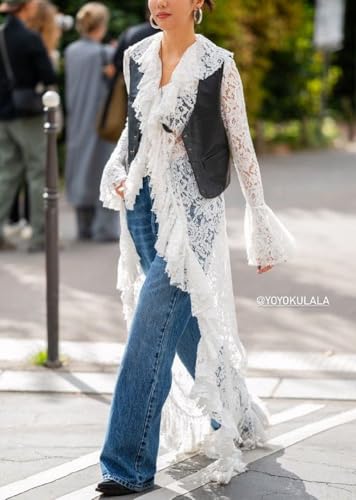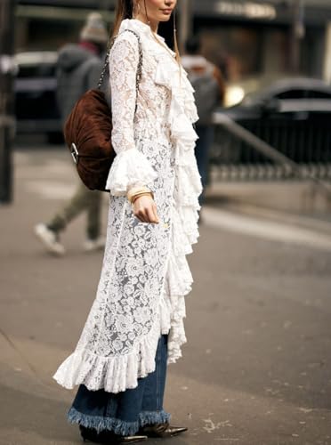More information about Women Long Lace Kimono Cardigan Flared Long Sleeve Tie Front Ruffle Shirt Dress See Through Flowy Cover Up Tops