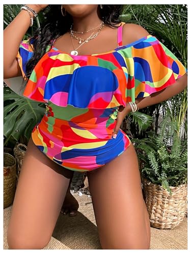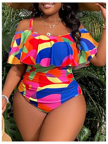 • Feature: Plus size, one piece swimwear for women, tummy control, colorblock, ruched, cold shoulder, adjustable straps, exaggerated ruffle trim