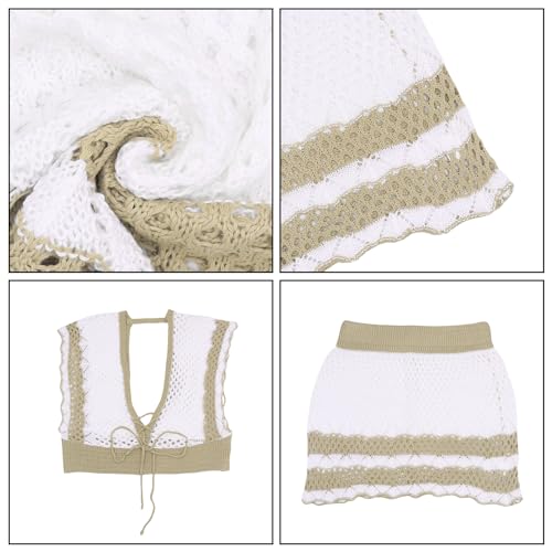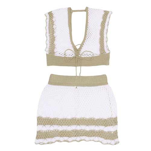 2 Piece Crochet Cover Up for Women Sexy Deep V Backless Crop Top Hollow Out Skirt Set Beach Swimsuit Bikini Coverups 2