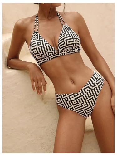 • Hawaii Outfits, Beach Vacation Clothes, 2 Pcs Sexy Triangle Bikini Sets, Geometrical Print, Double Strap, Backless Swim Tops with Low Waist Bikini Bottoms