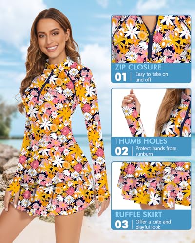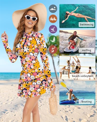 • [HIGH QUALITY STRETCHY SWIM SHIRTS] : Women raglan sleeves swim dress is soft, quick-dry, breathable, durable and lightweight, provides enough elasticity that makes you feel free and no pressure. This floral rashguard swimsuit for women designed with a zipper for easy on and off.