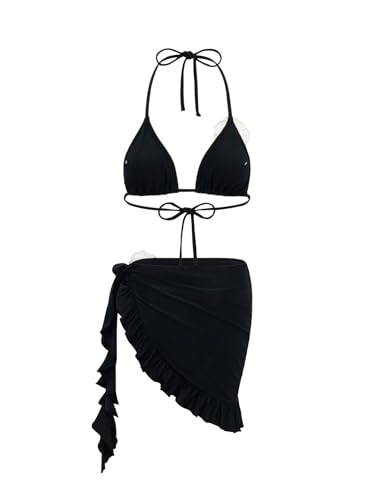 HOT ! Verdusa Women's 3 Piece 3D Flower Halter Bikini Set Self Tie High Cut Swimsuit with Cover Up Skirt
