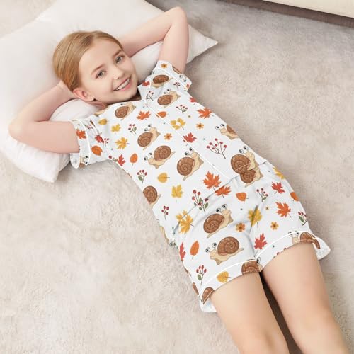 Satin Pajama Sets Short Sleeve Cute Snails with Autumn Leaves Button Down Silky Nightwear 2 Piece PJS 5-14Y 6
