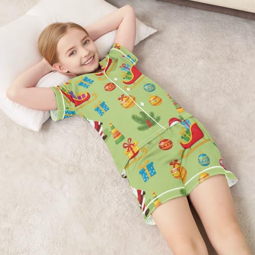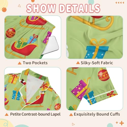 Satin Pajama Sets Short Sleeve Santa Sleighs Button Down Silky Nightwear 2 Piece PJS 5-14Y 1